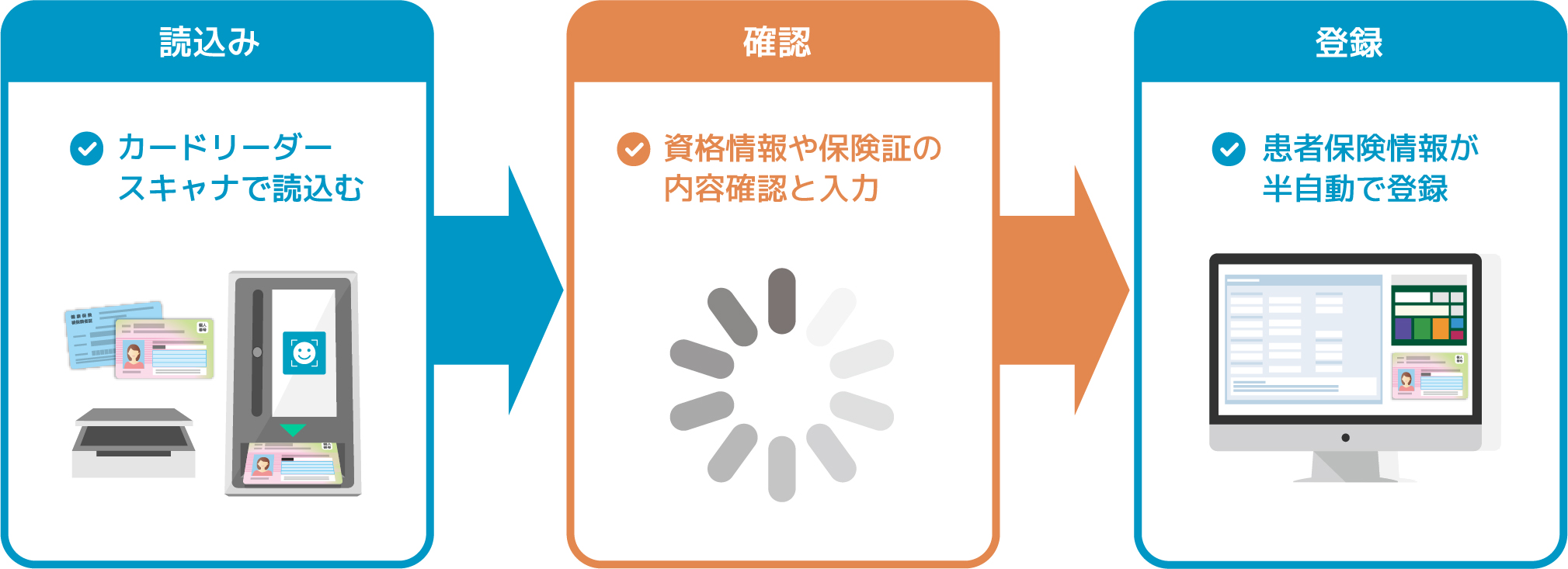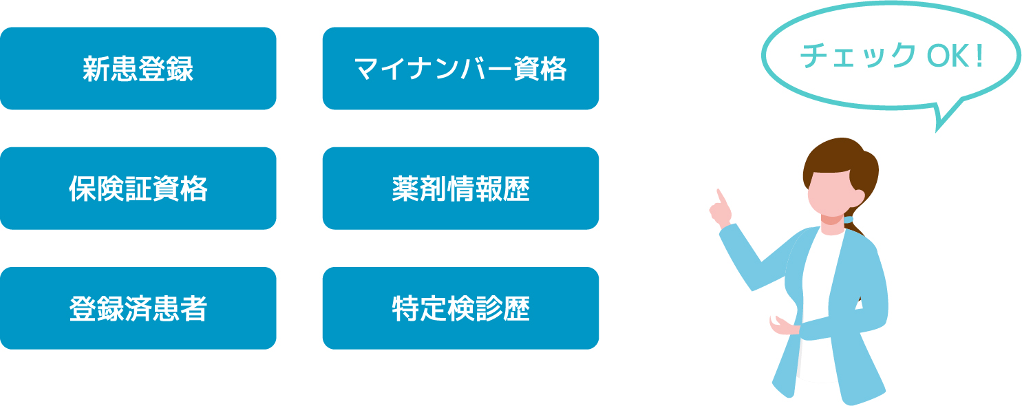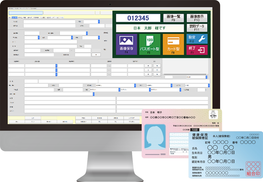 マイナンバーカードや保険証を読み込むことにより現在の保険が有効か無効かオンライン資格確認システムにより確認することができ、正確な保険情報登録が可能になります。